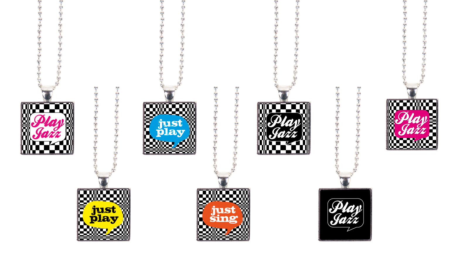 Zilverkleurige, vierkante hanger (28 x 28 mm) met bovenop de afbeelding een afgerond vierkant glazen plaatje (ca. 4 mm dik). De hangers worden geleverd met een stevig collier van zilverkleurige bolletjes (ca. 2 mm dik).